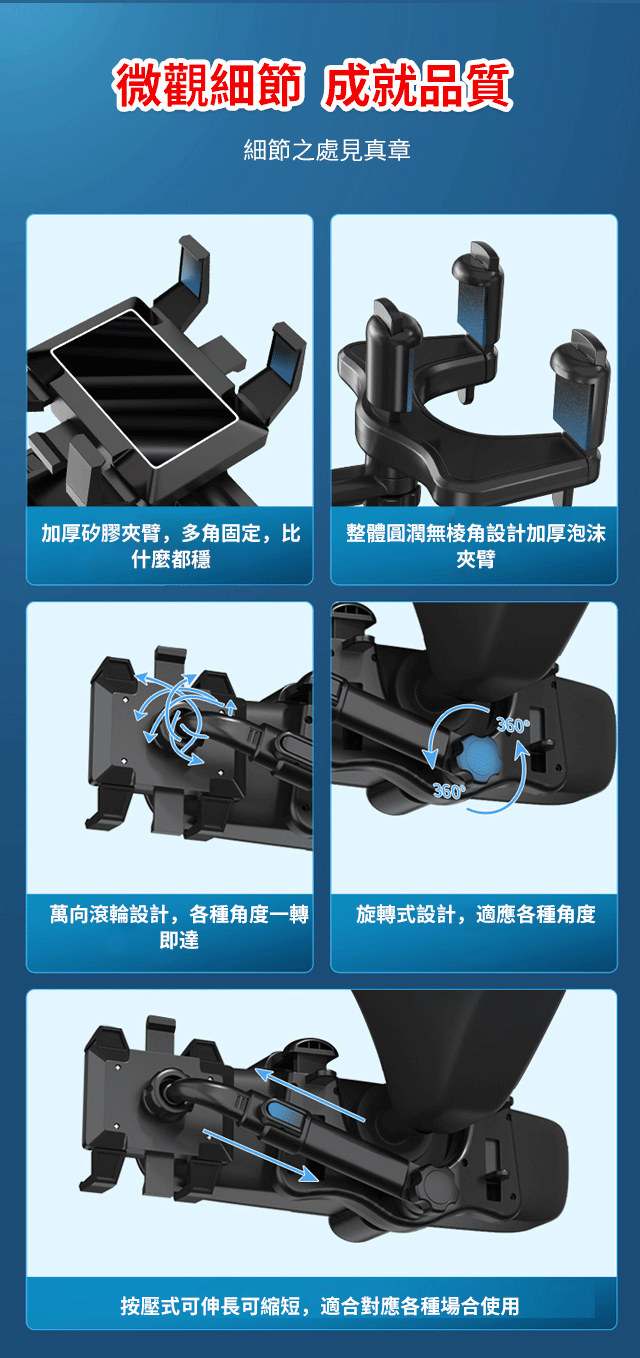 安全、穩固、便捷,採用加厚防滑矽膠夾子 + 航空級鋁合金支架桿,夾子邊緣圓潤包邊,輕按即可牢牢咬住汽車出風口或儀表台。 360 度旋轉球頭搭配阻尼調節環,手指輕轉即可切換橫豎屏角度,導航時豎屏看路線清晰,等紅燈時橫屏和家人視頻不費眼,角度固定後紋絲不動,無需反復調整。