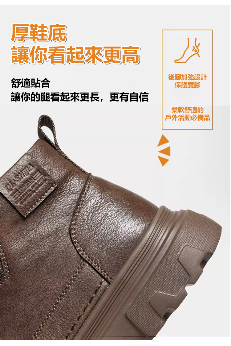 頭層牛皮打造,自帶溫潤珠光光澤,防潑水還抗刮抗變形,穿 3 年都不塌。側邊拉鍊一拉即穿超方便,隱形增高 5cm 顯腿長,高彈鞋墊走路不酸,防滑鞋底適配梅雨季。