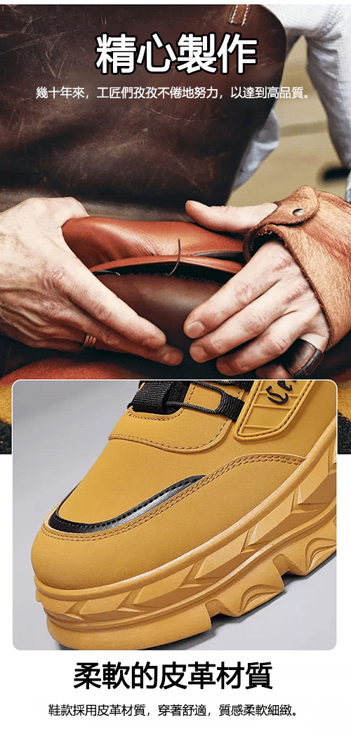 專為台灣男性設計。頭層軟牛皮觸感細膩,內建高彈足弓墊,久走、久站不酸腳。防寒力是普通款三倍。 15 年工匠手工縫製,線跡牢固, 100 次彎折不變形。微厚鞋底顯高 3 厘米,適合通勤、登山等多個場景。