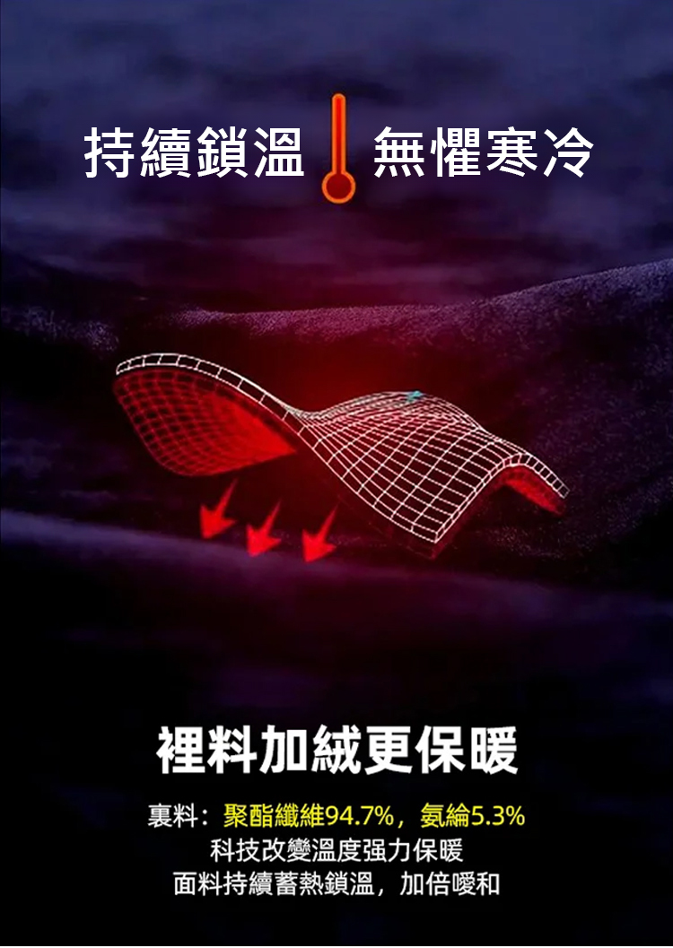 褲子內裡採用超細絨毛,保暖效果是一般褲子的5倍,外層防風布料能有效阻擋冷空氣。特殊布料可快速排出汗氣,保持整日乾爽不悶熱。四面高彈性設計,蹲下活動都自在,修身剪裁更顯腿長。