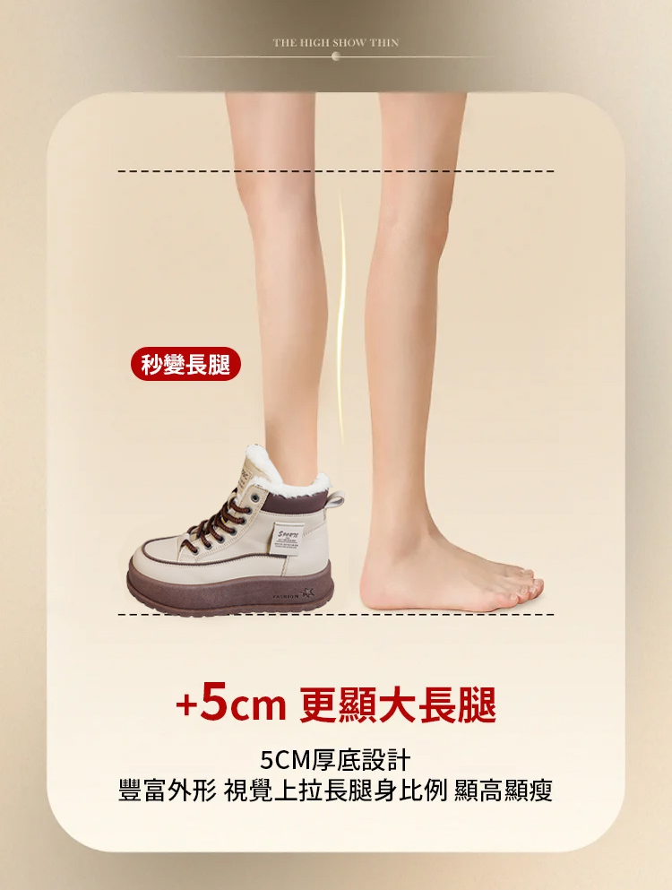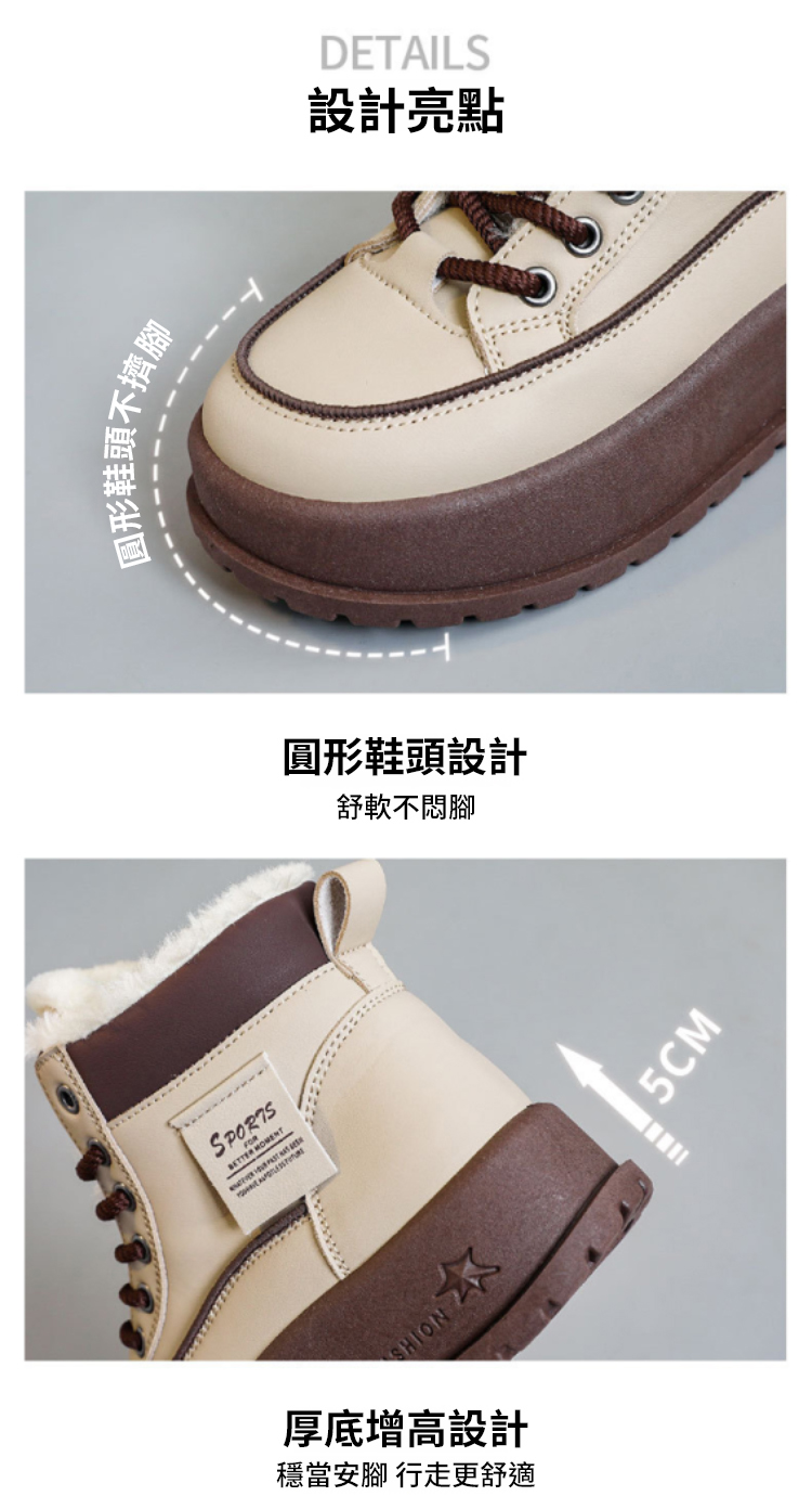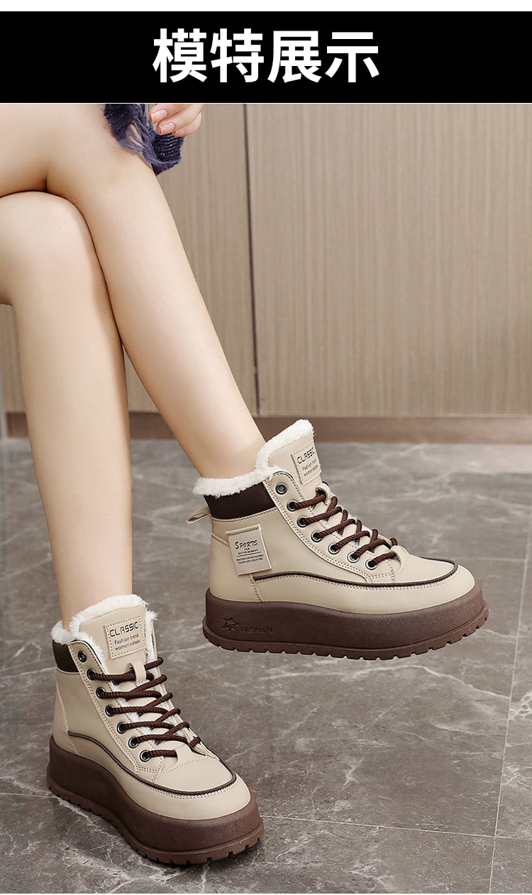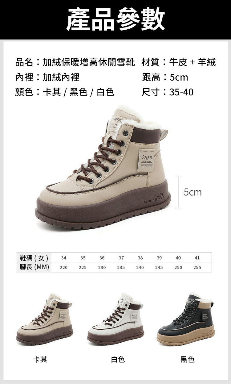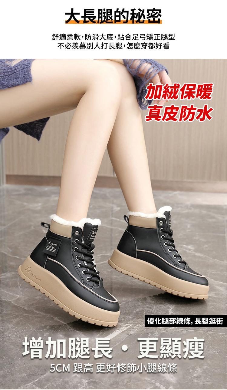 優質軟皮鞋面貼合不磨腳,高筒設計護住腳踝還能修飾小腿線條,粗厚底暗藏 5cm 增高,小個子秒變長腿。內裡滿鋪厚實羊羔絨,零下 15℃也能鎖溫保暖,防滑橡膠底雨天雪地行走穩當。
