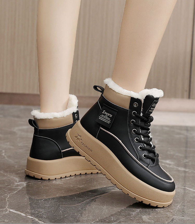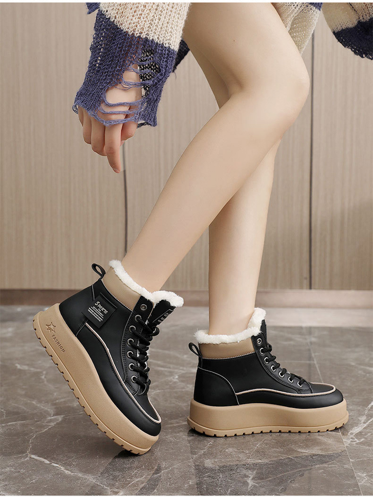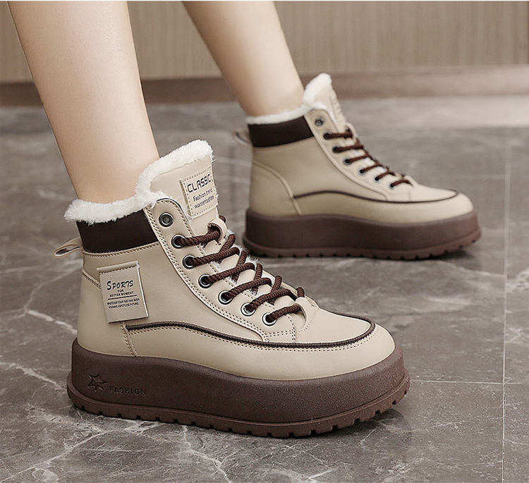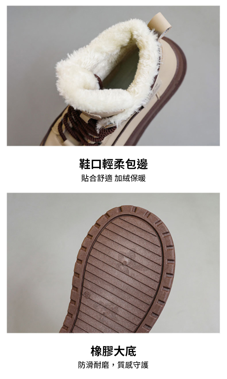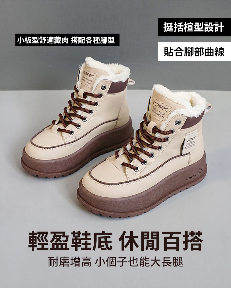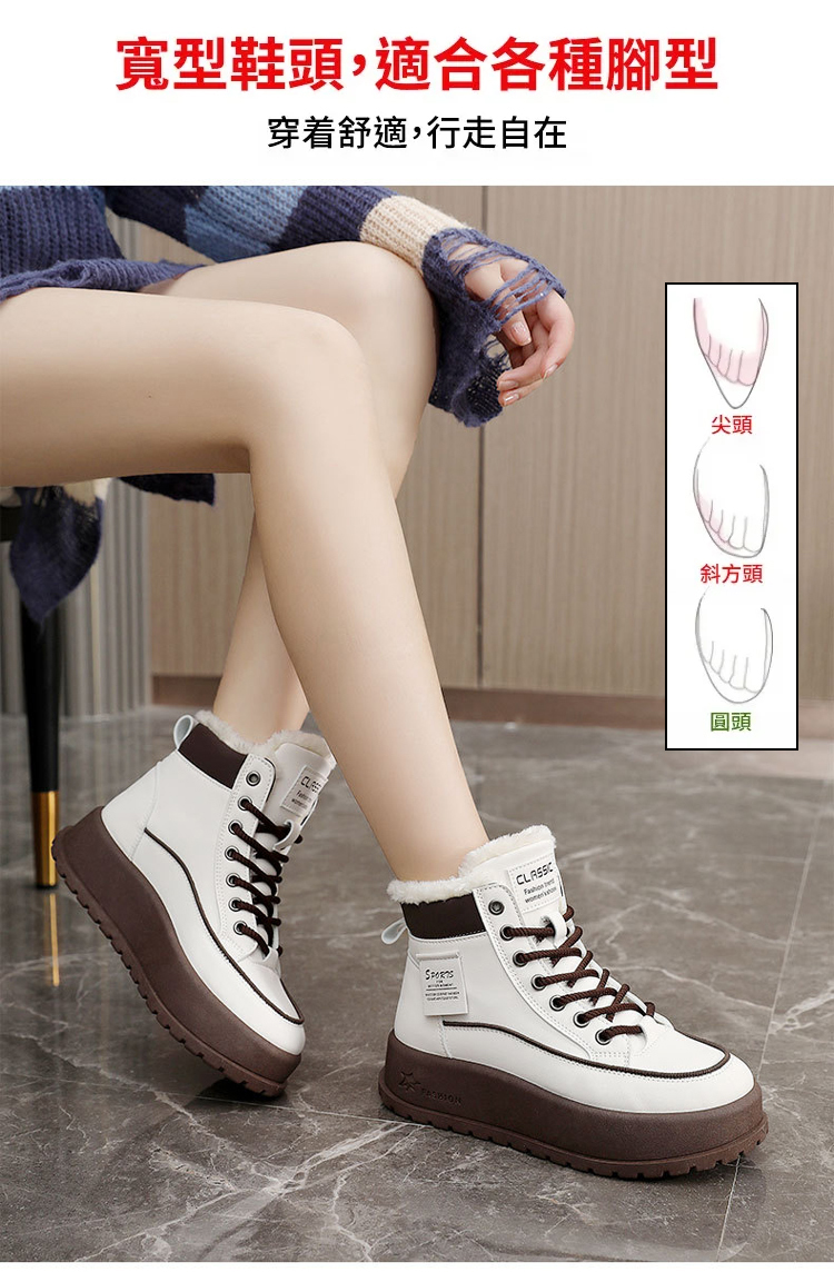 優質軟皮鞋面貼合不磨腳,高筒設計護住腳踝還能修飾小腿線條,粗厚底暗藏 5cm 增高,小個子秒變長腿。內裡滿鋪厚實羊羔絨,零下 15℃也能鎖溫保暖,防滑橡膠底雨天雪地行走穩當。
